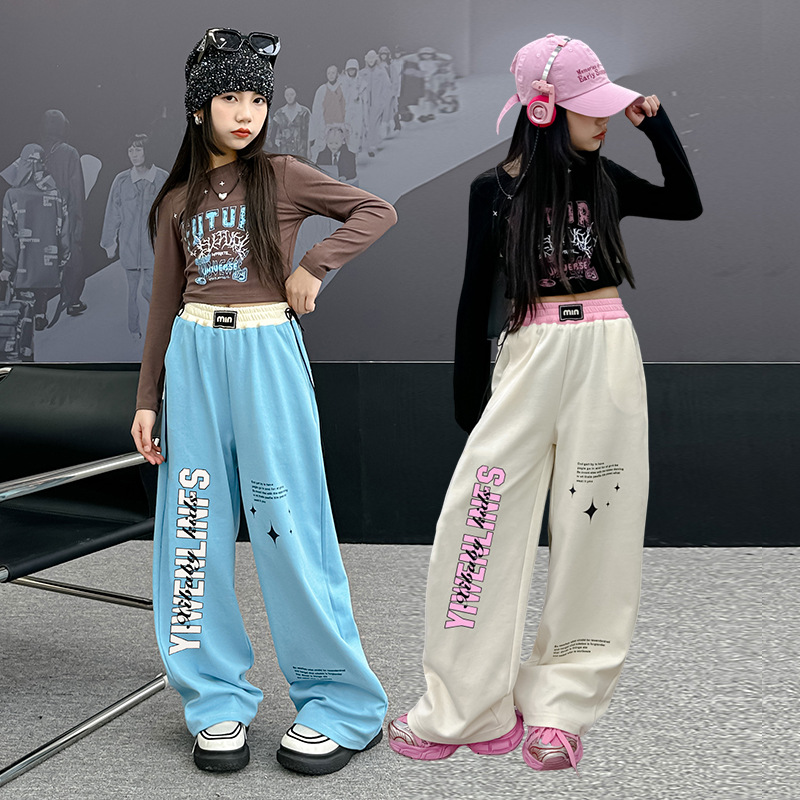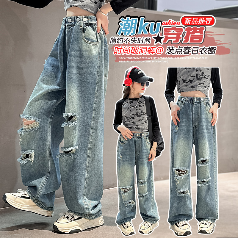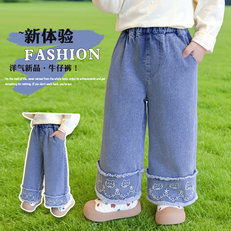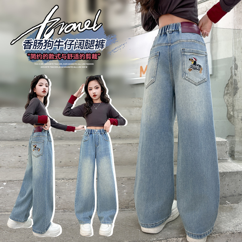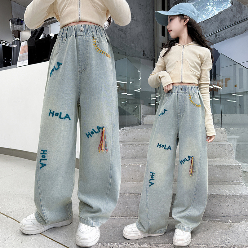 女の子のジーパン春秋2025新型子供の子供の大きい子供の広腿のズボンの春のストレートのズボンのカジュアルなズボンのファッション