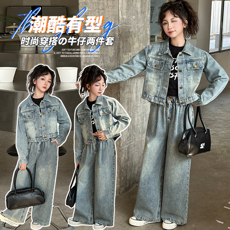 女の子のデニムの春の服のスーツの2024の新型の韓国版の中で大きい子供の洋気のネットの赤い春と秋の2つのセットの子供の潮の服