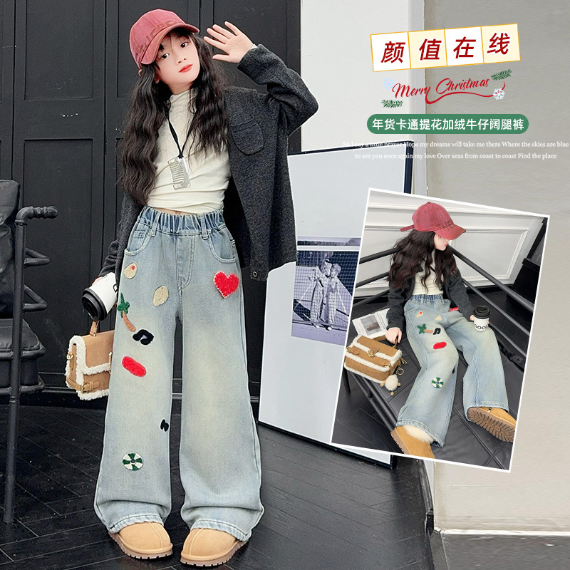 女の子の冬の一体の絨毛のジーパンの2024の新型の厚い流行のカジュアルなズボンの子供の秋冬の項のベルベットのズボン