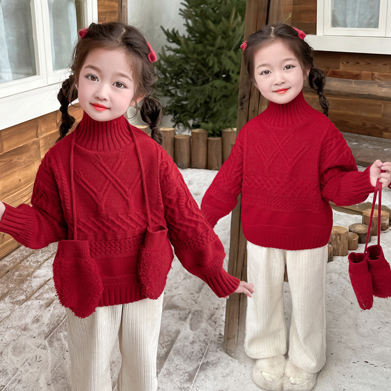 女の子のクリスマスの服装の赤いニットのセーターの秋冬の金の2024の新型の子供の冬は厚い半分の高さの襟の中で合わせます。