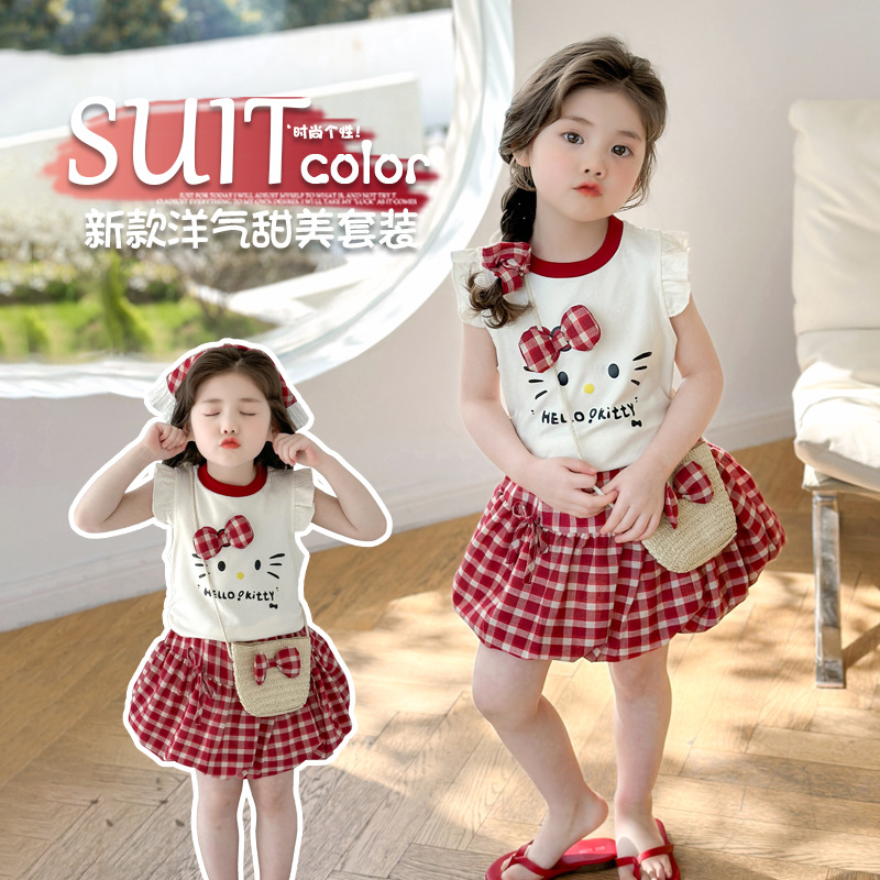 女の子の夏のスーツ 2025 新しい子供のフライングスリーブ漫画 Tシャツチェック柄スカートツーピースベビー花のつぼみスカート