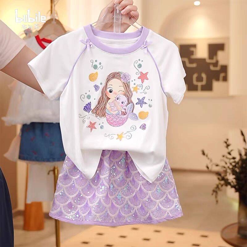 女の子の夏のスーツ225の新しい子供の洋気のプリントの漫画のtシャツのスパンコールの半身のスカートの2つのセットの人魚