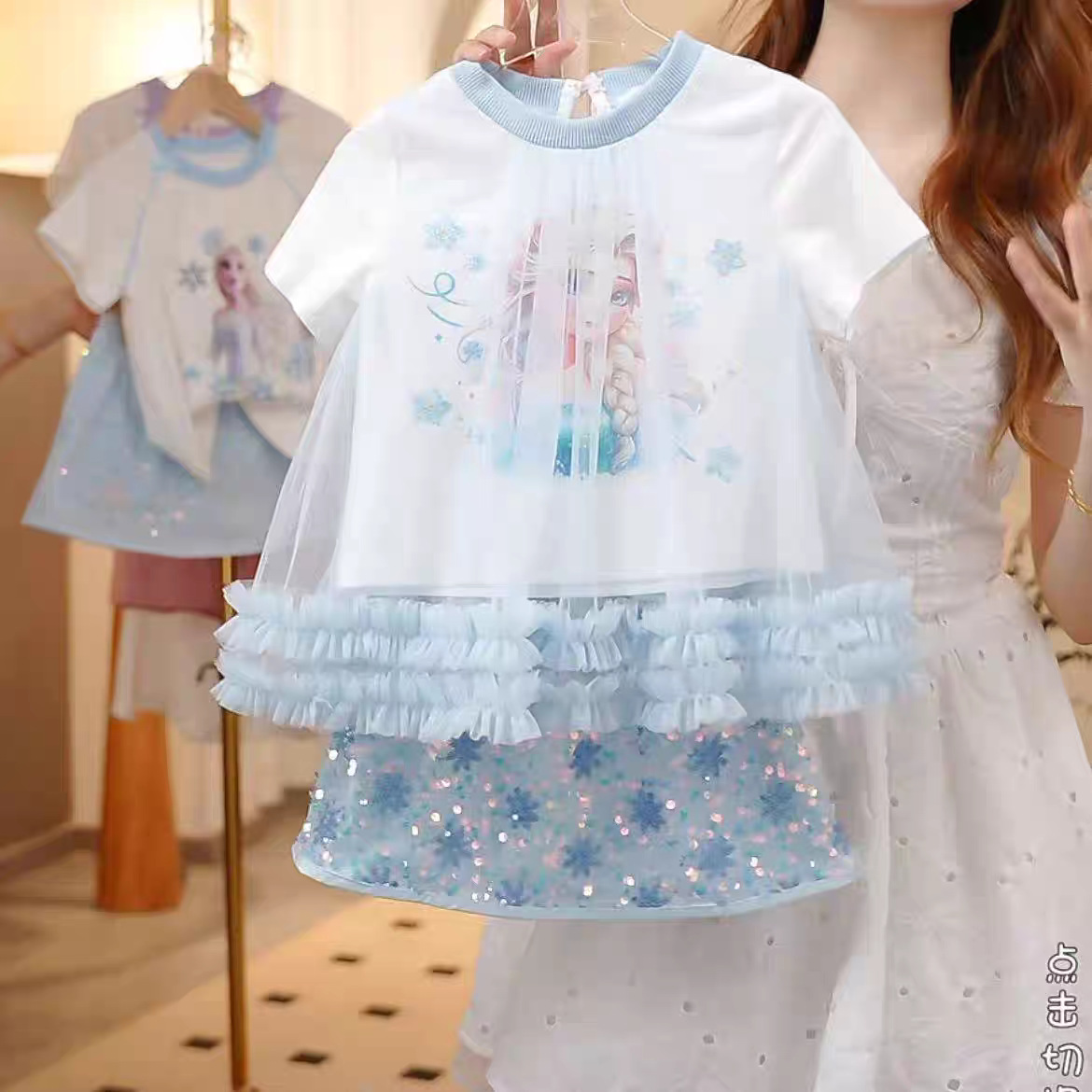 女の子メッシュ半袖スパンコールスカートスーツ 2025 夏女の子偽ツーピースプリンセスエルザ Tシャツスカート t