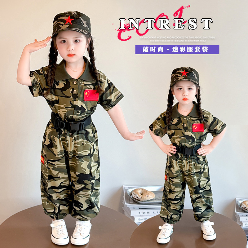 子供のアーミーグリーン迷彩服半袖スーツツーピース学生ダンスパフォーマンス服軍事訓練服夏カジュアルファッション