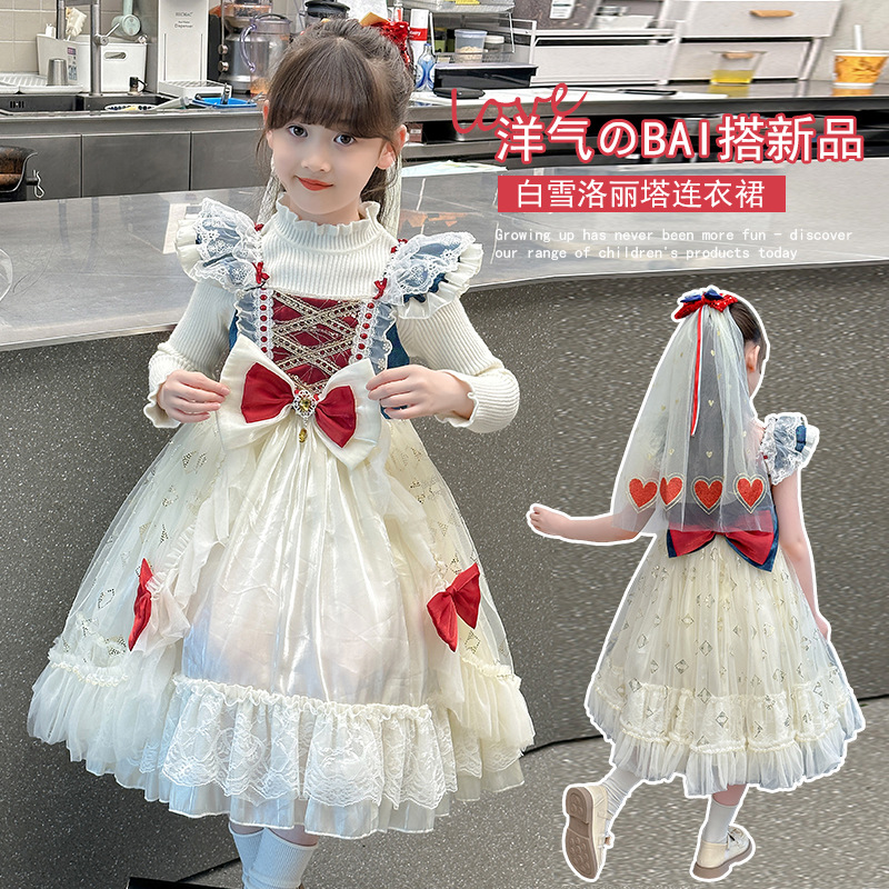 白い雪の王女のスカートの女の子の秋の2024の新型のLolitaのロリータのネットの紗の蓬のスカートの少女のワンピース