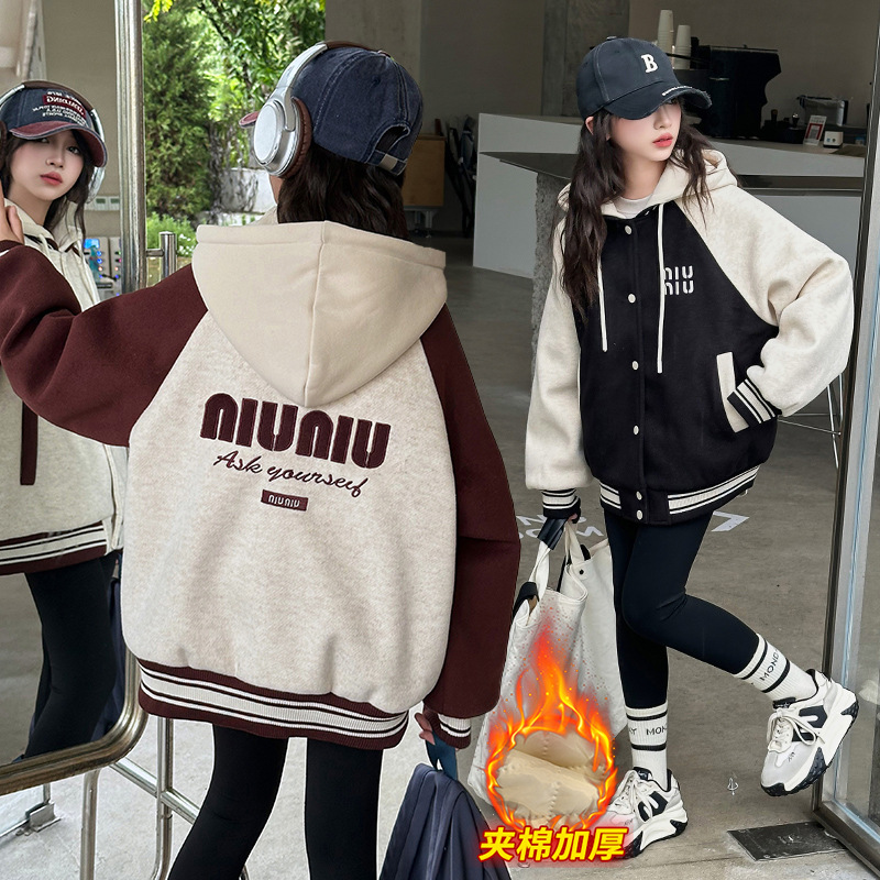 女の子の秋冬にベルベットのコート野球服2024の新しい子供のスポーツファッションジャケットの女の子の上着が湿っている
