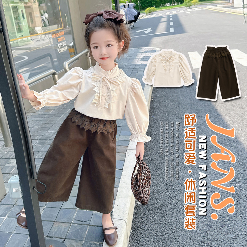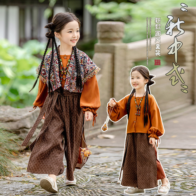 女の子の秋の服装の国風のスーツの2024の新型の子供のネットの赤い広い足のズボンの洋風の3セットの赤ちゃんのカジュアルな漢服