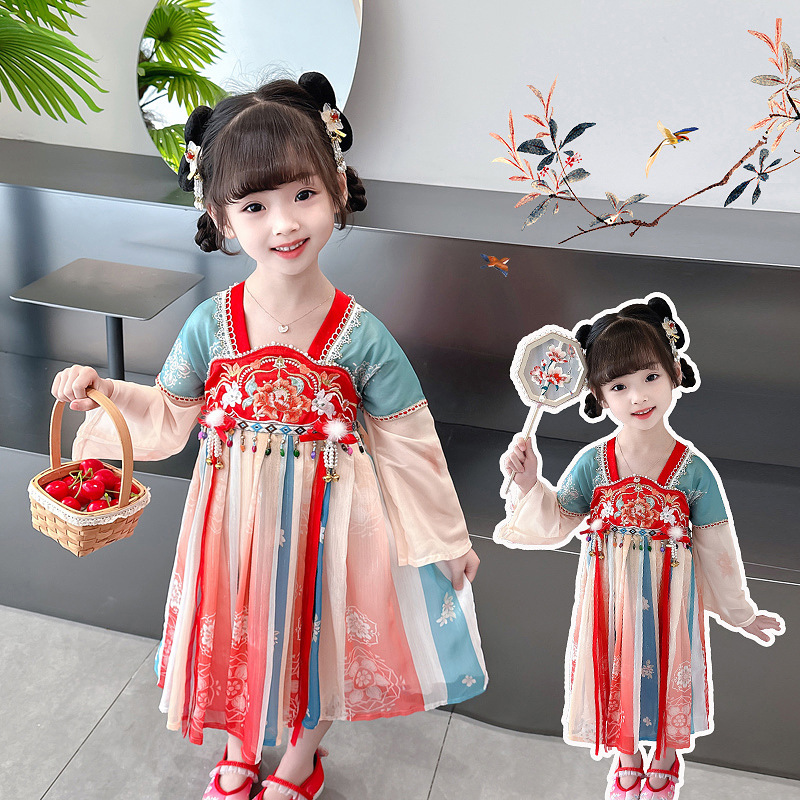 女の子の漢服春秋の金2024の新型の赤ちゃんの春の時代の中国風の王女のスカートの子供の唐の服のワンピース