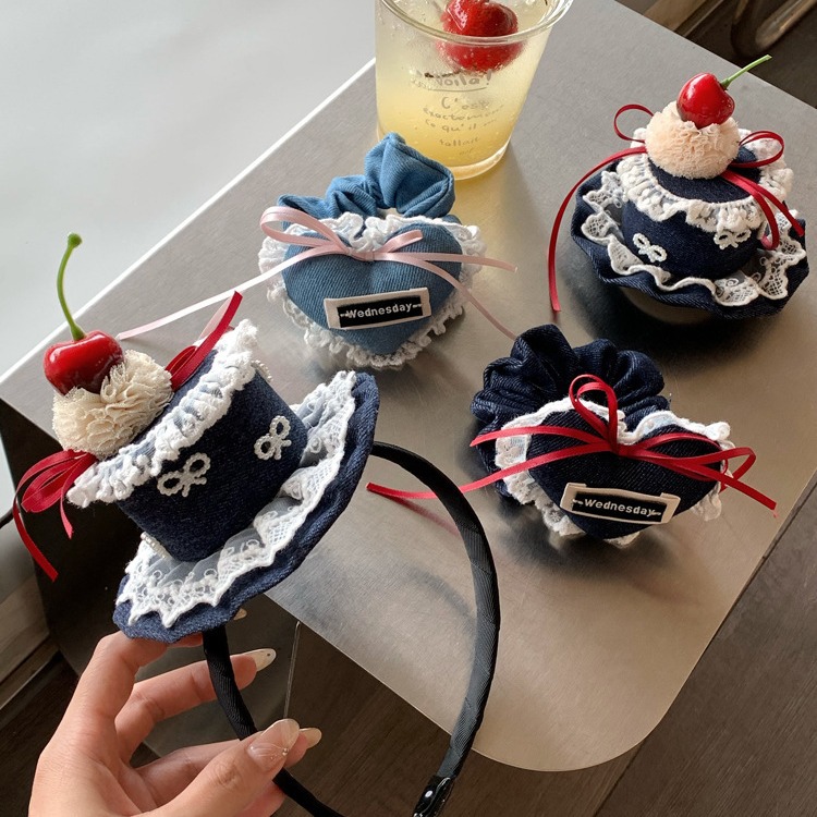 レトロデニムパーティーチェリーレースケーキ帽子髪フープ女誕生日パーティー装飾ヘッドフープ頭飾り小道具