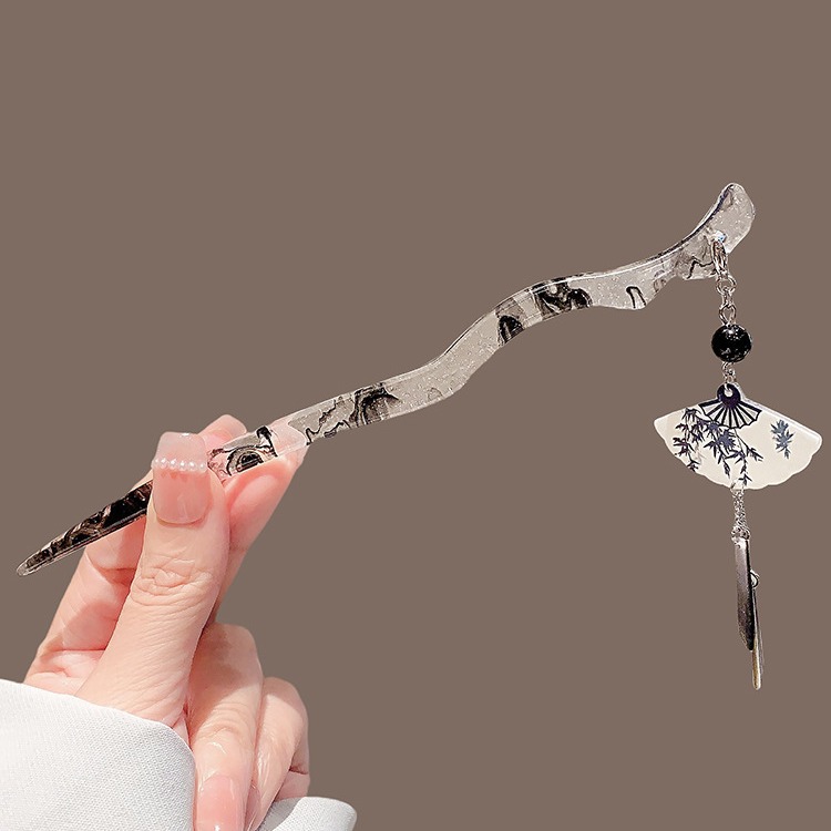 古風新中国式扇子高級感水墨画流蘇ヘアピン小衆独特のチャイナドレス馬面スカートヘアピン