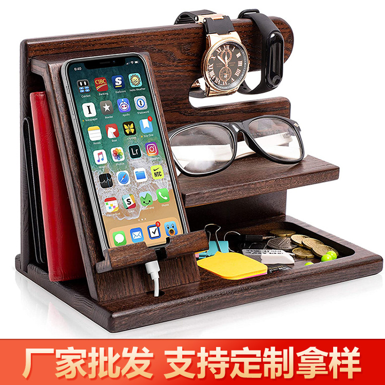 クロスボーダー木制携帯电话ホルダーデスクトップ木制携帯电话充电ホルダー腕时计ディスプレイスタンド多机能拡张ドックブラウン
