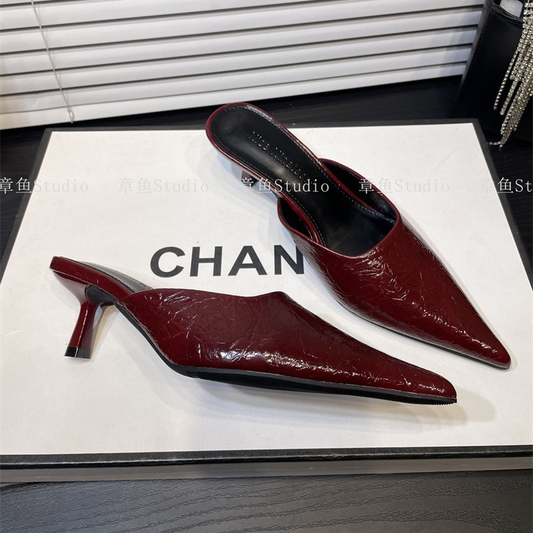 欧米の風の先の細いと包頭の半スリッパの女性は2025新型の夏の酒の赤いハイヒールのミュラーのサンダルを着ます。