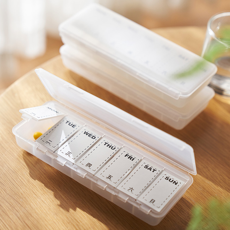 シンプルなポータブル小型ピルボックス、プラスチック密封、防湿、週7日ピルボックス