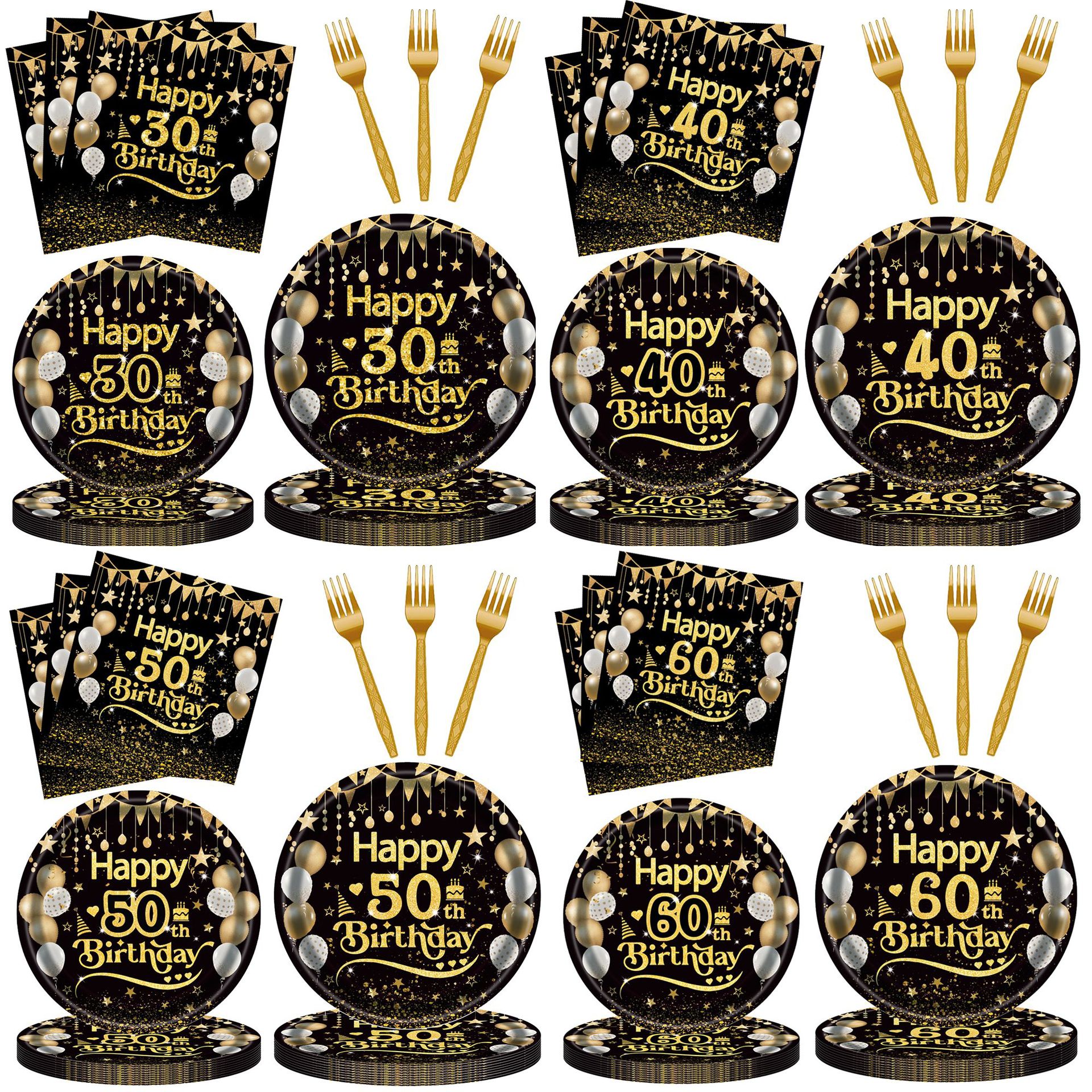 96pcs黒金歳30/40/50/60/70/80歳パーティー食器セット紙皿ティッシュフォーク食器