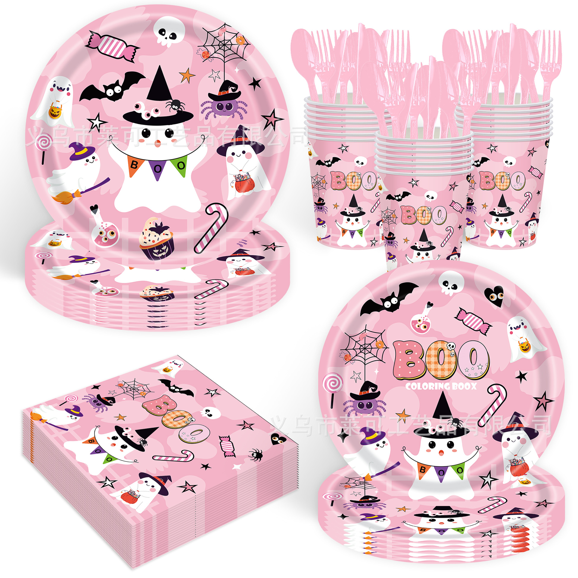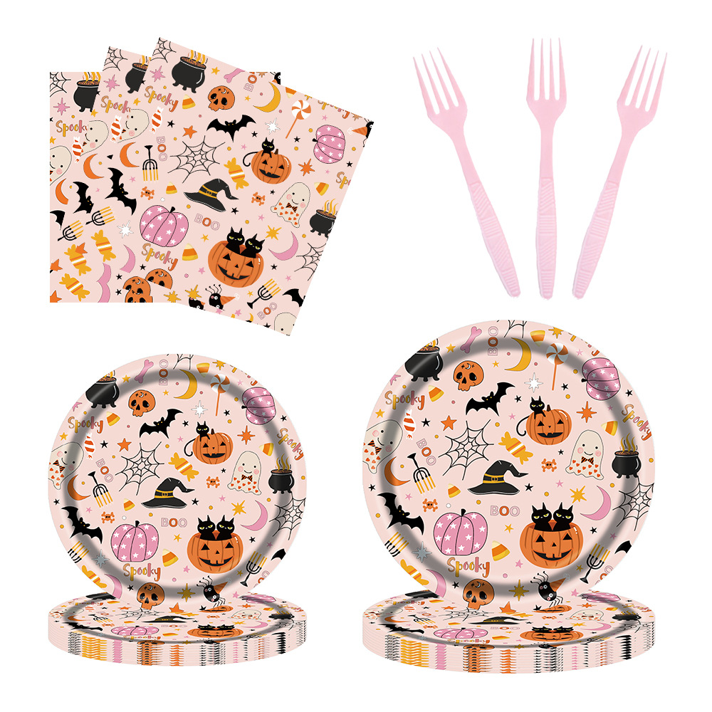 新しいピンクハロウィンパーティー食器ティッシュペーパーカップ紙皿フォーク 96 個パーティー使い捨て紙皿用品