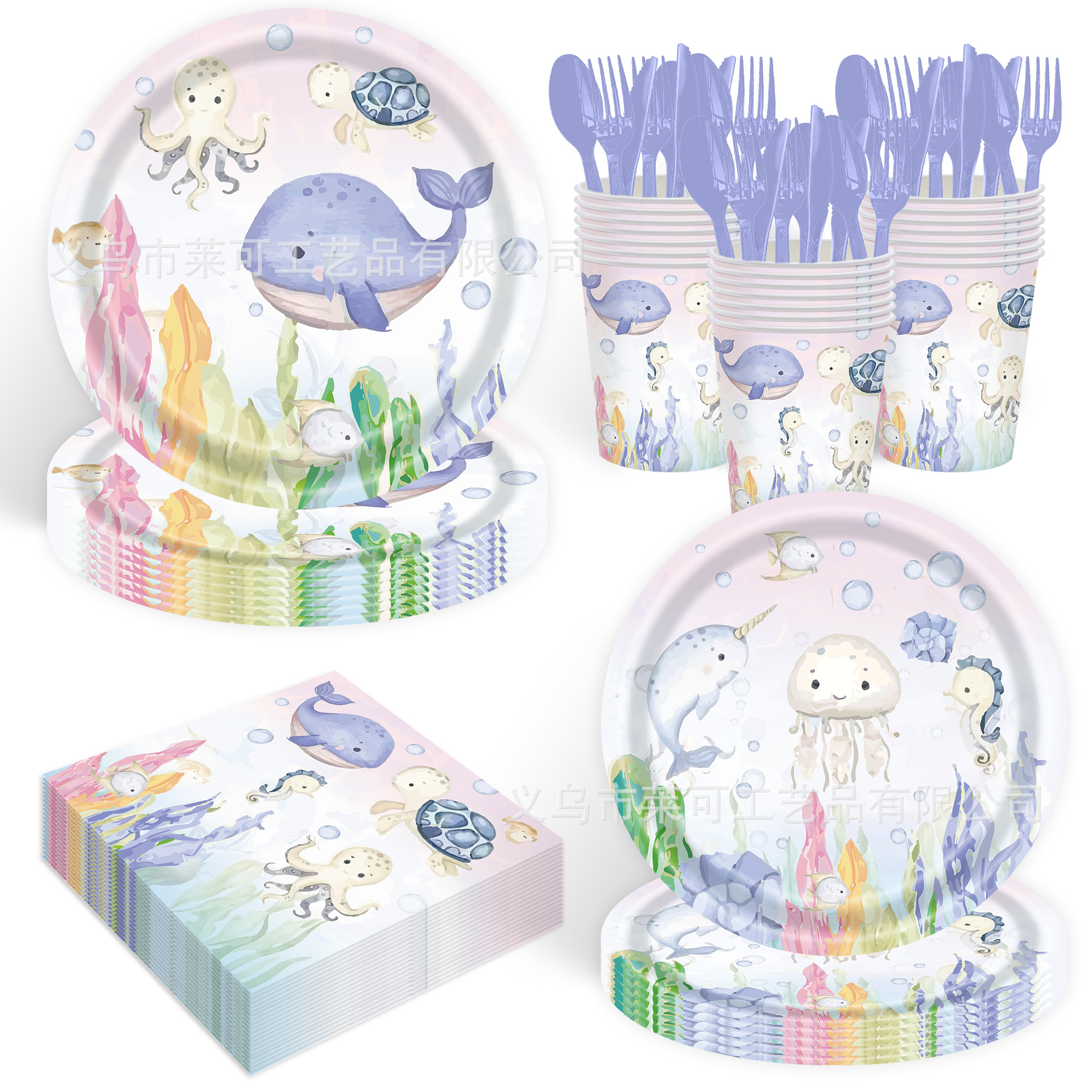 新しい水彩クジラ海中動物テーマパーティー食器ティッシュペーパーカップ紙皿パーティー使い捨て食器
