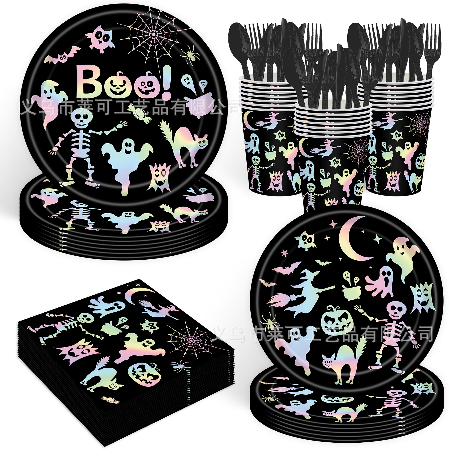 新しいカラフルなハロウィーンパーティー食器ティッシュペーパーカップ紙皿ナイフフォークスプーンゴーストパーティー使い捨て紙皿