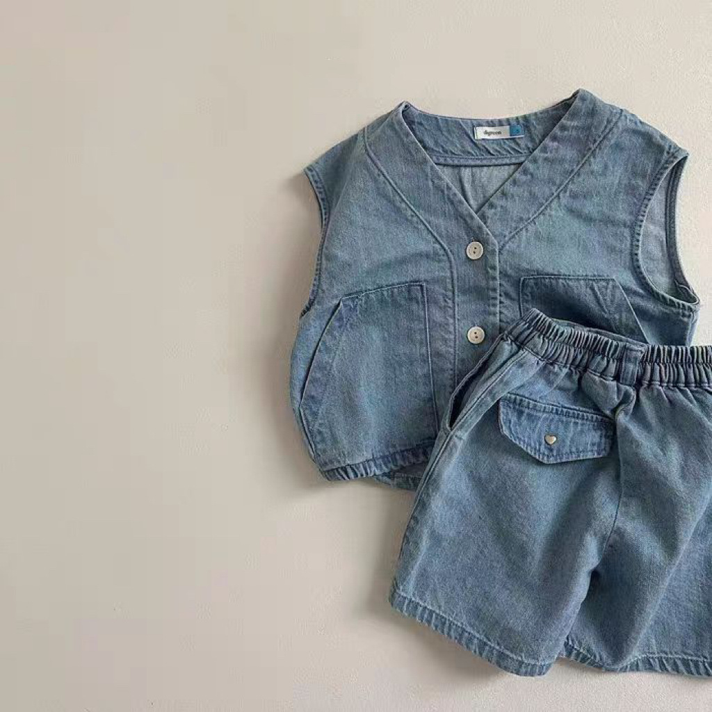 韓国版の夏の薄いベストセットの子供の赤ちゃんの綿のポケットの半ズボンのシンプルな赤ちゃんのかわいいノースリーブのセット