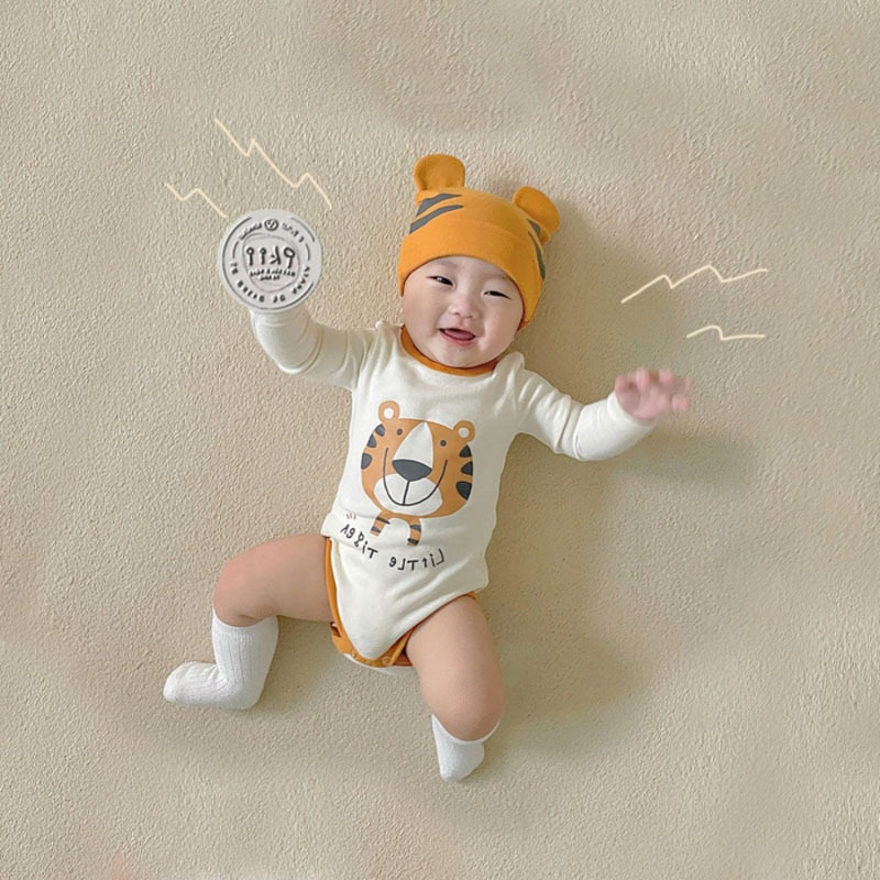 韓国版ins新生児トラが満月百日間の男女赤ちゃん綿の可愛い形の連体服を着ています。