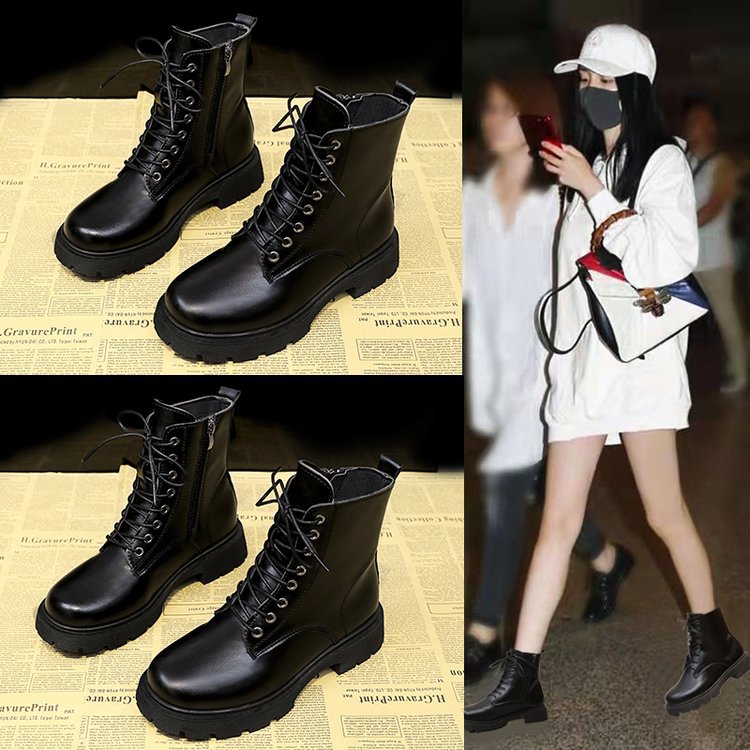 2024年の新型の女性は厚い底のマーティンの靴の女性の英倫の風の春秋の新型の丸い頭とベルベットの単里の皮の靴を合わせます。