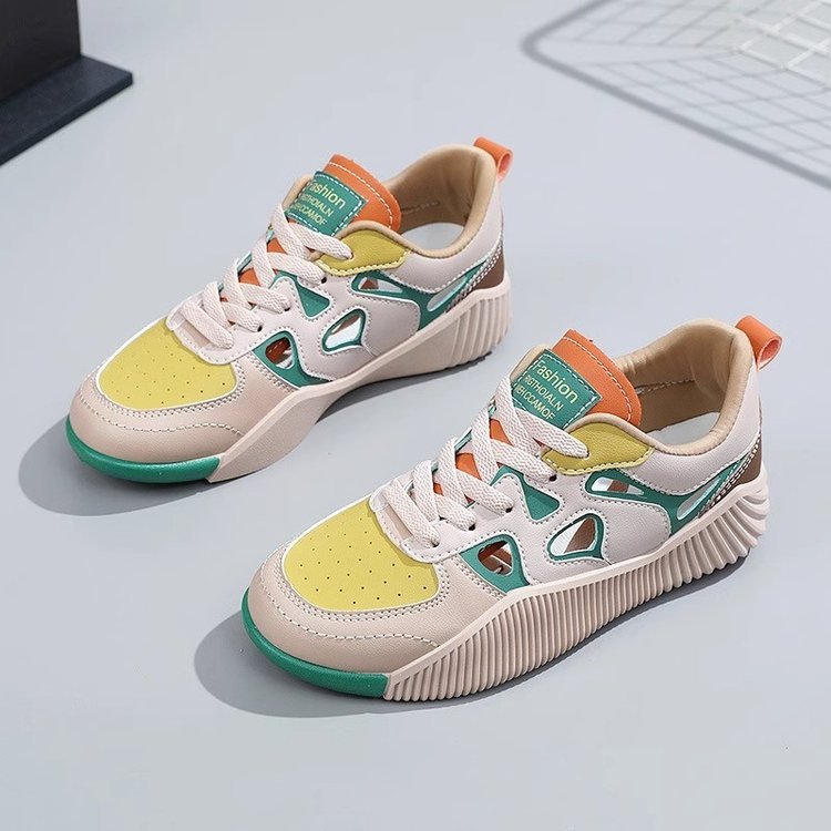2024新型春秋百合韓版の厚い底は個性的な爆発的なスポーツのレジャーの皮の板の靴をつづり合わせて越境します。