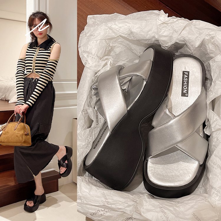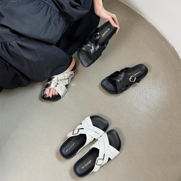 2024夏の新型韓国版ネット赤交差一字サンダル浅口厚いサンダルカジュアルスリッパ女性外着