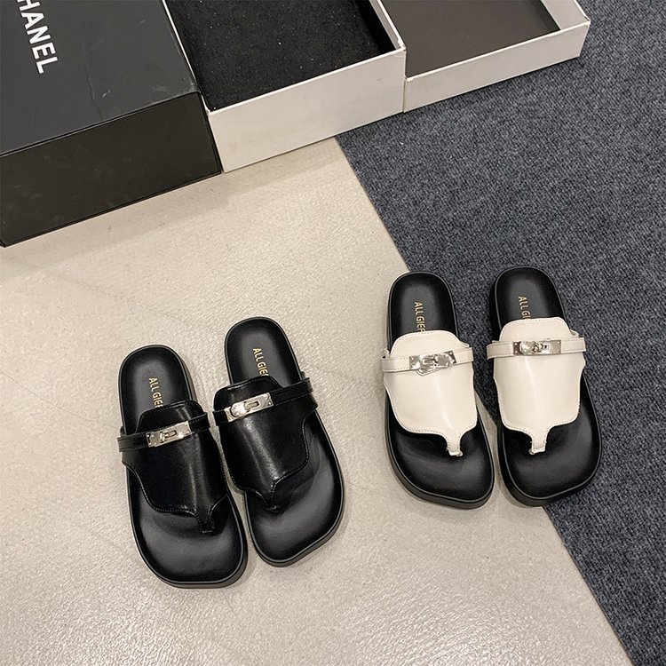 鏡にまたがる2024夏の新型百合一字ボタン付きの坂と中とレトロなビスケットの厚い底のサンダルの女性ローマ靴