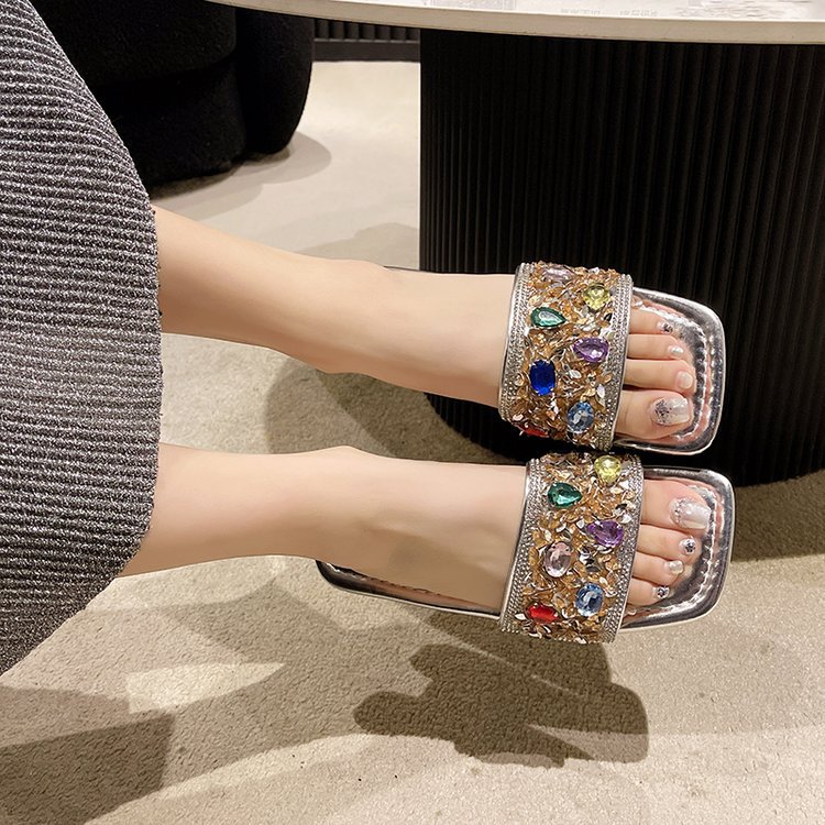 2024新型の外国貿易のフラットスリッパのファッション的な露指の七色のドリルのサンダルの女性の外はビーチの靴の大きいサイズの42を着ます。