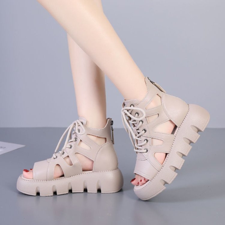 2024夏の新型レトロな厚い底のローマのサンダルの女性のビスケットの底の透かし彫りの魚の口の高い組のひものサンダル