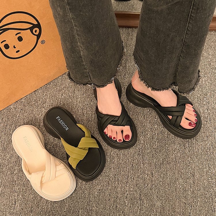 2024新型のフランス式のスカートの緑色のネットの赤い超火の厚い底のスリッパの女性の夏の外は軽やかで柔らかい底の冷たいスリッパを着ます。