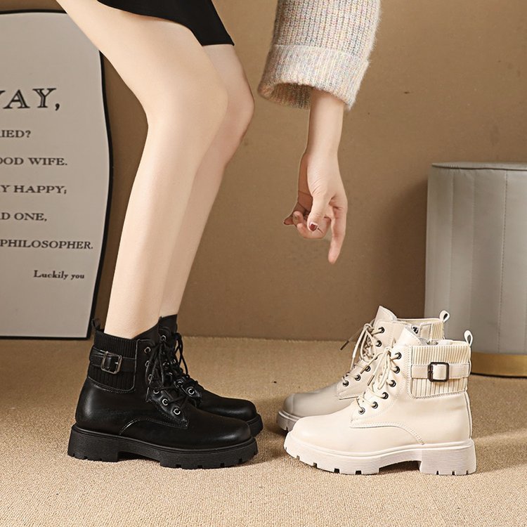 2025秋冬新作レースアップラウンドトゥベルトバックルチャンキーヒールショートチューブ英国風ファッショントレンドマーティンブーツ外国貿易