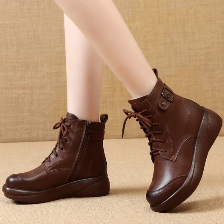 秋冬2024新型ソフトレザーレトロなマーティンブーツの女性ベルベットの毛の女性ブーツのお母さんの綿の靴のビスケットの厚い底のショートブーツ