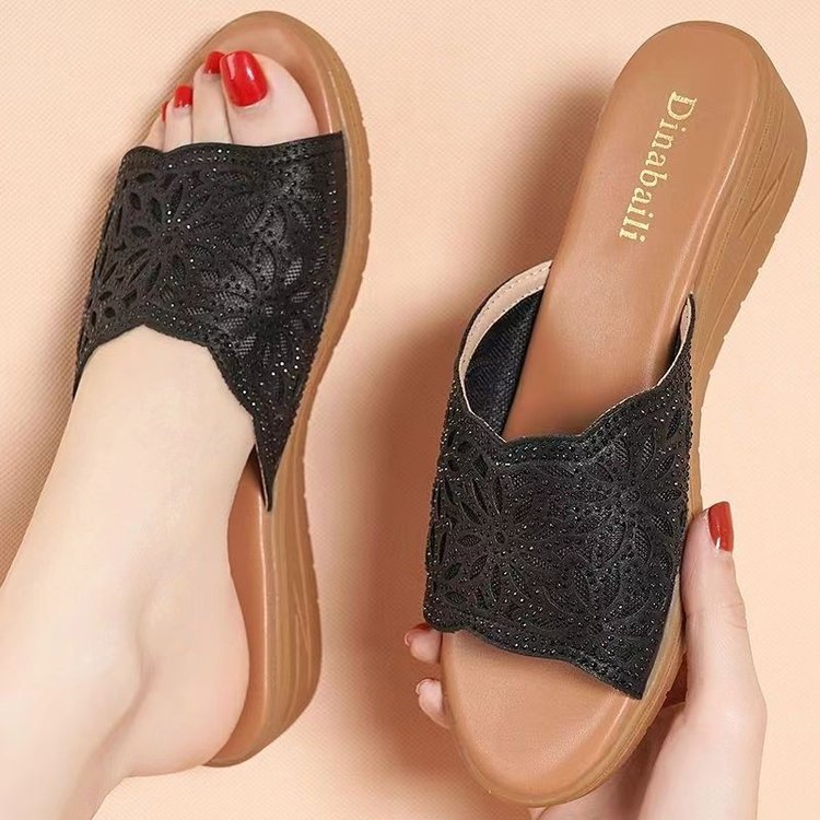 2024夏の新型中高年ファッションの透かし彫りのドリルの坂と冷たいスリッパの女性のカジュアルな1字のお母さんのスリッパの女性