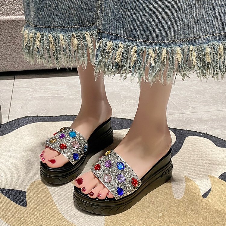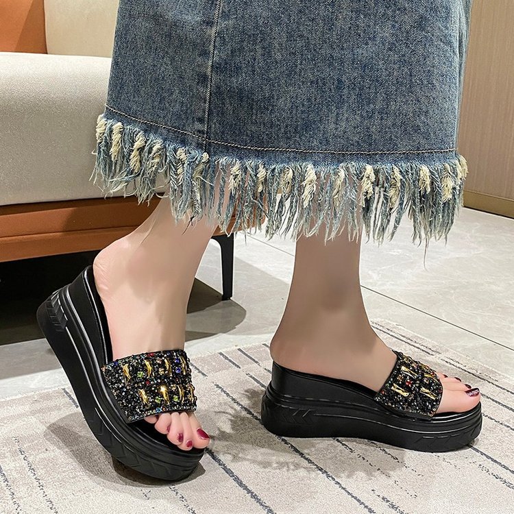 2024新型夏の韓国版の露指のドリルのビスケットの厚い底のスリッパの女性は外でスパンコールの1字型のハイヒールのサンダルを着ます。