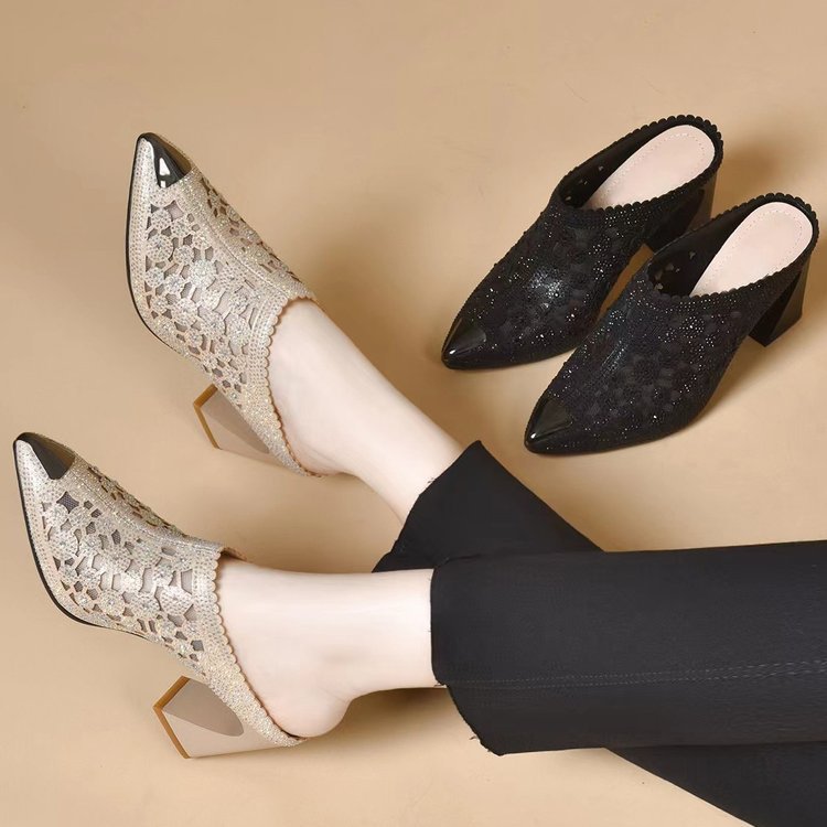 2024夏の新型の先端の優雅な気質の包頭の半スリッパの女性はファッションの百合のハイヒールの女性靴の大きいサイズを着ます。
