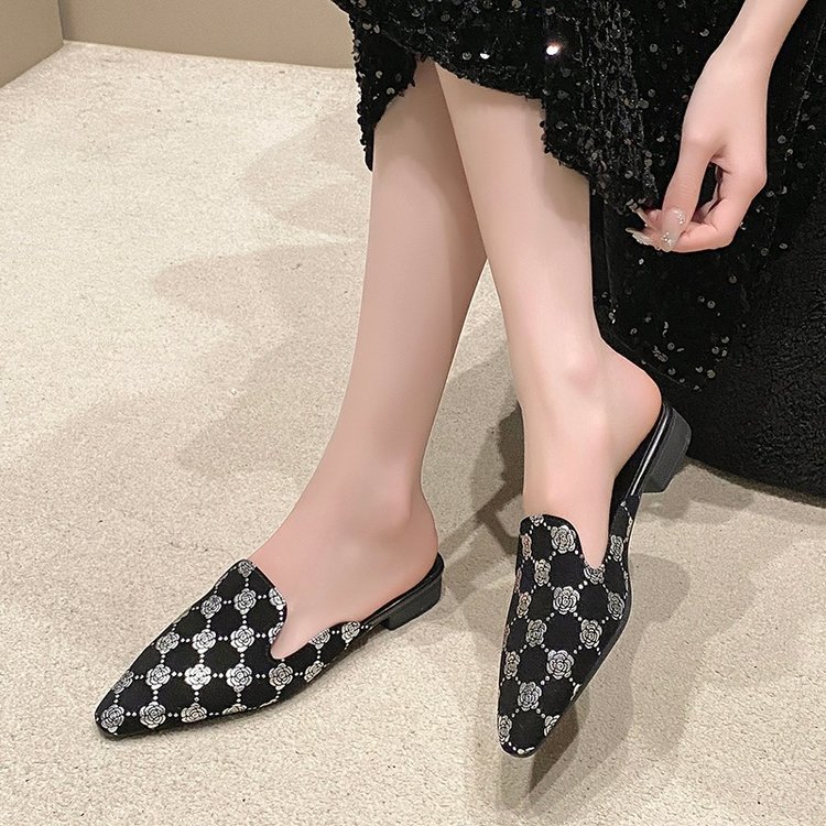 2024夏の新型韓国版の大きいサイズのファッションの包頭の平の冷たいスリッパは簡単に尖った布の面の平の底の半分は女性の靴を引っ張ります。