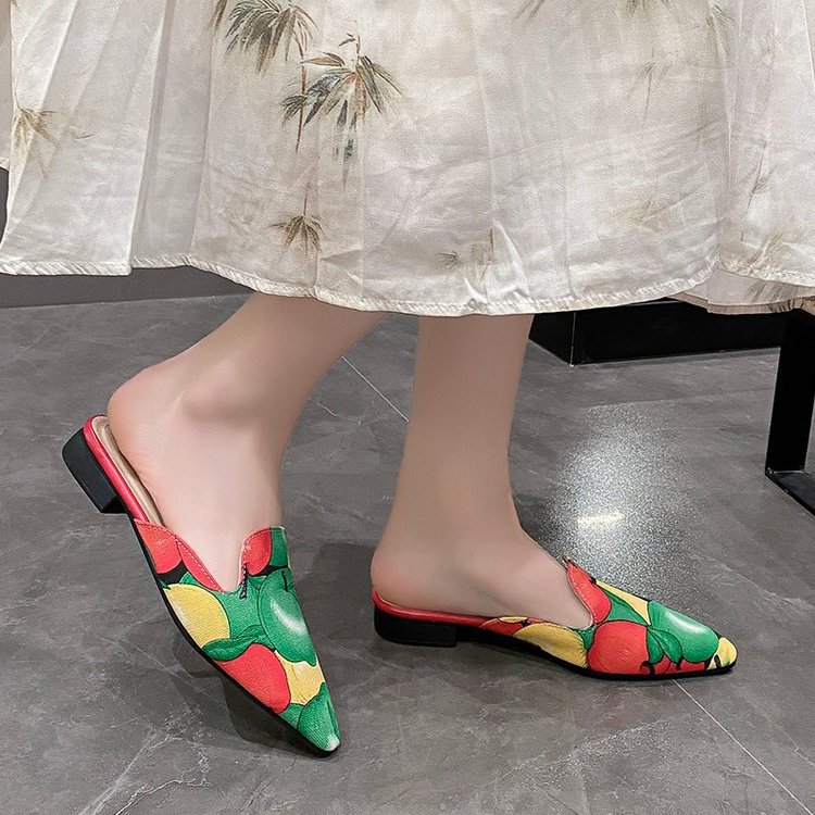 クロスボーダーの包頭の半分は外を引きずって金のミュラーの靴の平底の女性のマックの外国貿易の花の図案のスリッパを着ます。