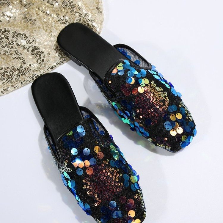 2024夏の対外貿易の大きいサイズのカラーのスパンコールの先の半分の靴の外で平底の頭の冷たいスリッパの欧米の靴を着ます。