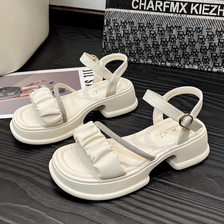 2025年夏新作 厚底サンダル レディース 韓国風 快適 ラインストーン パテントレザー ソフトソール ワンストラップ オープントゥ フィッシュマウス ハイヒール