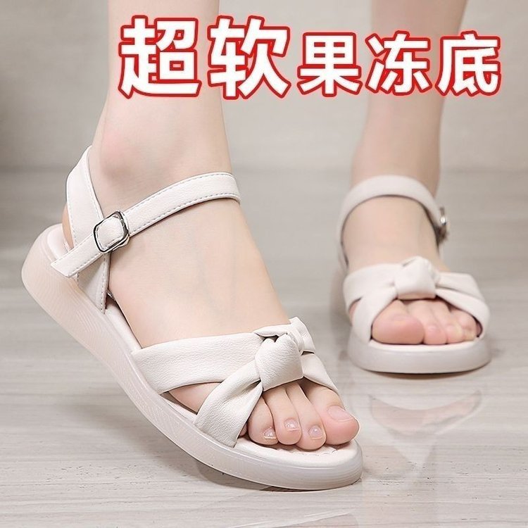 2024年の新型のお母さんの靴の夏の蝶結びのネットの赤い超火の平の丸い頭のファッションの靴はスカートのサンダルを配合します。