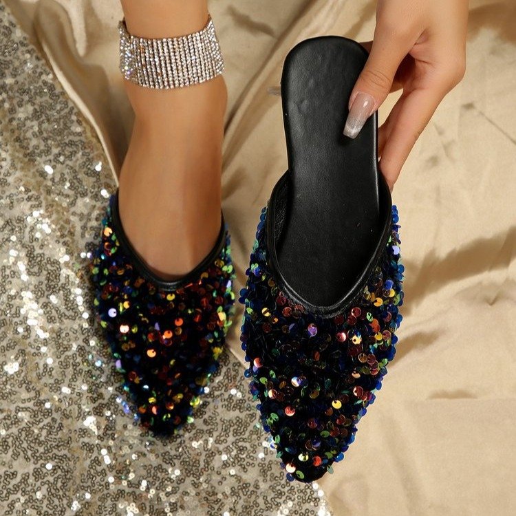 2024夏の新型ネット赤スパンコール包頭の涼しい色の外に女性が国境を越えた対外貿易の平底ファッションスリッパを着ている