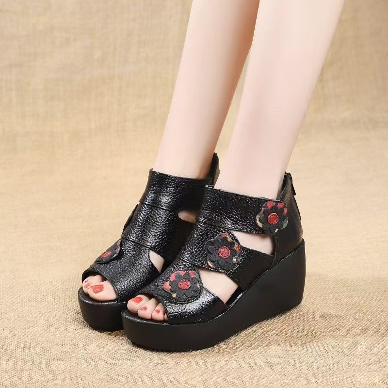 2025 夏厚底レディースシューズウェッジヒールサンダルエスニックスタイルファッション妖精ローマンフィッシュマウスハイトップママシューズクロスボーダー