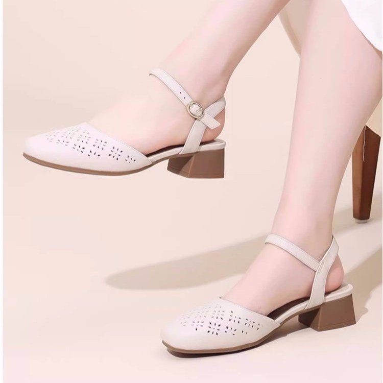 2025夏の新型の通気性の透かし彫りの四角いサンダルの女性の包頭の太いヒールの中で1字のバックルの靴とスカートを配合します。