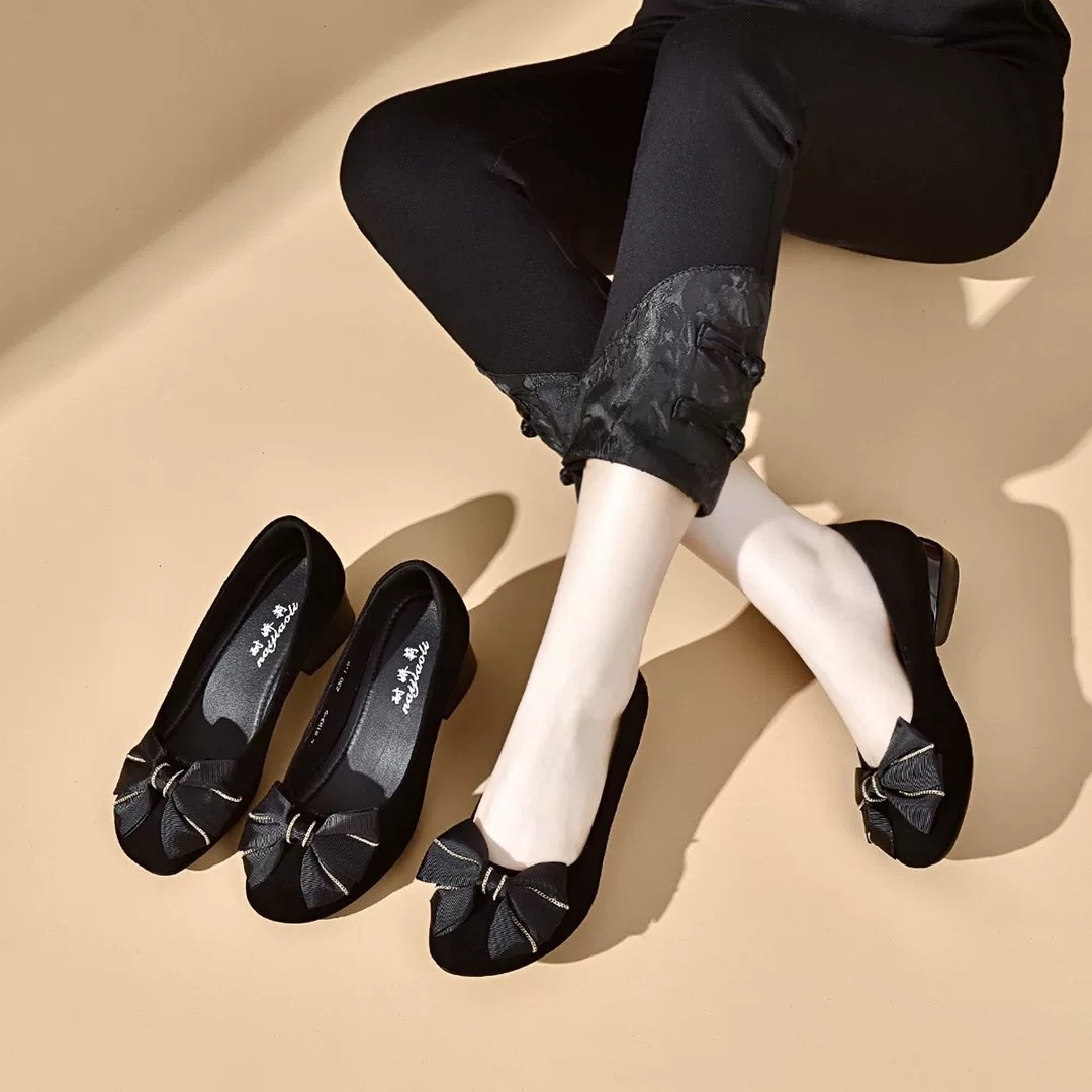 2025 春、夏、秋の新スタイルのリボンラウンドトゥ多用途ローチャンキーヒールの小さな靴、快適で柔らかい底の女性の浅い口
