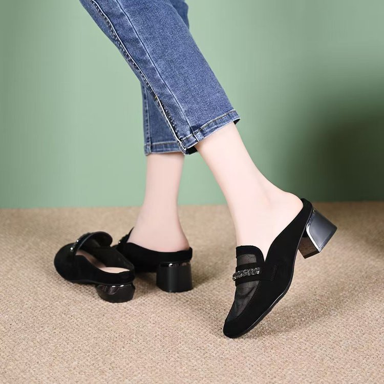 2025 新しい夏中空つや消しローヒール包頭通気性ハーフスリッパ女性のアウターウェアサンダル怠惰なメッシュ靴
