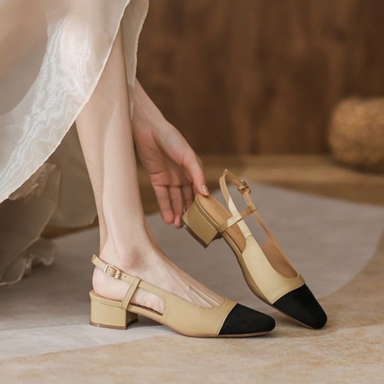 2025夏の小香風包頭サンダルの女性の太さと角頭の組み合わせの仕事の靴の浅い口の包頭のハイヒール