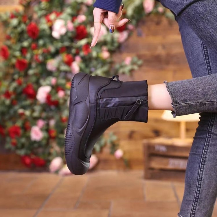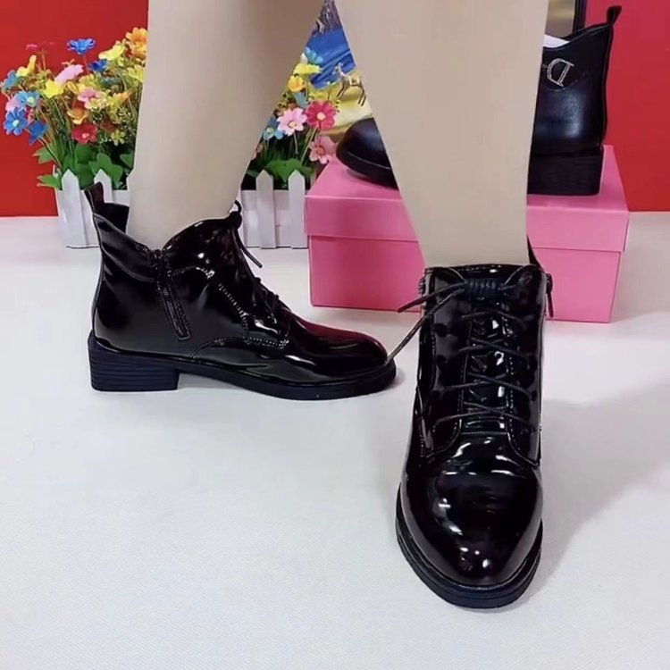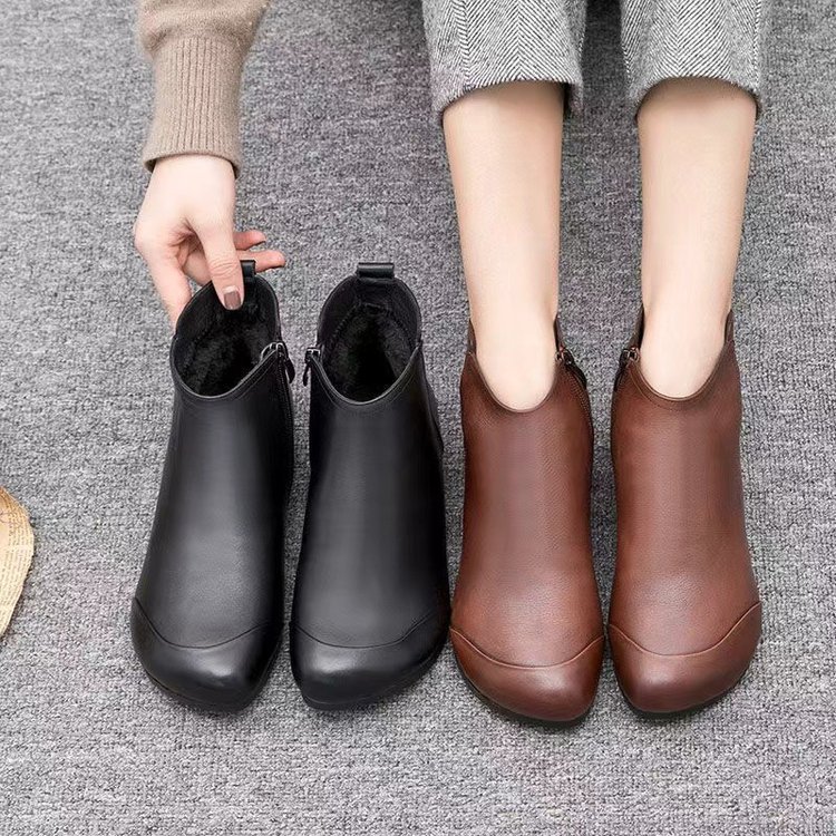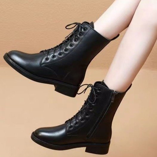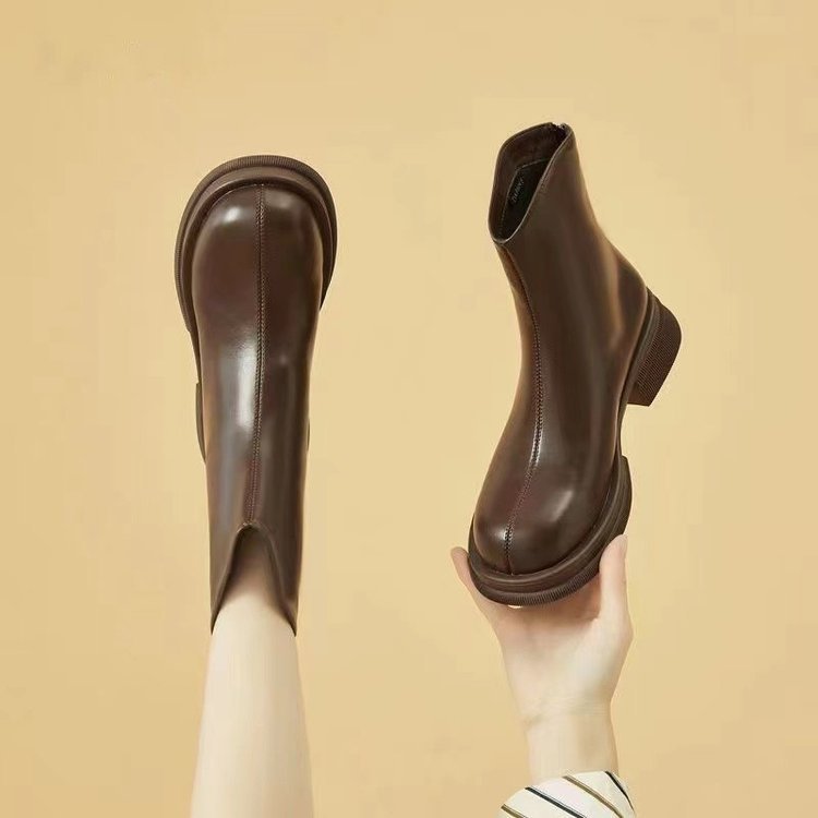 2024年秋冬新作後ファスナー革ブーツソフト底丸い頭厚い底英倫風ショートブーツ女性痩せブーツ
