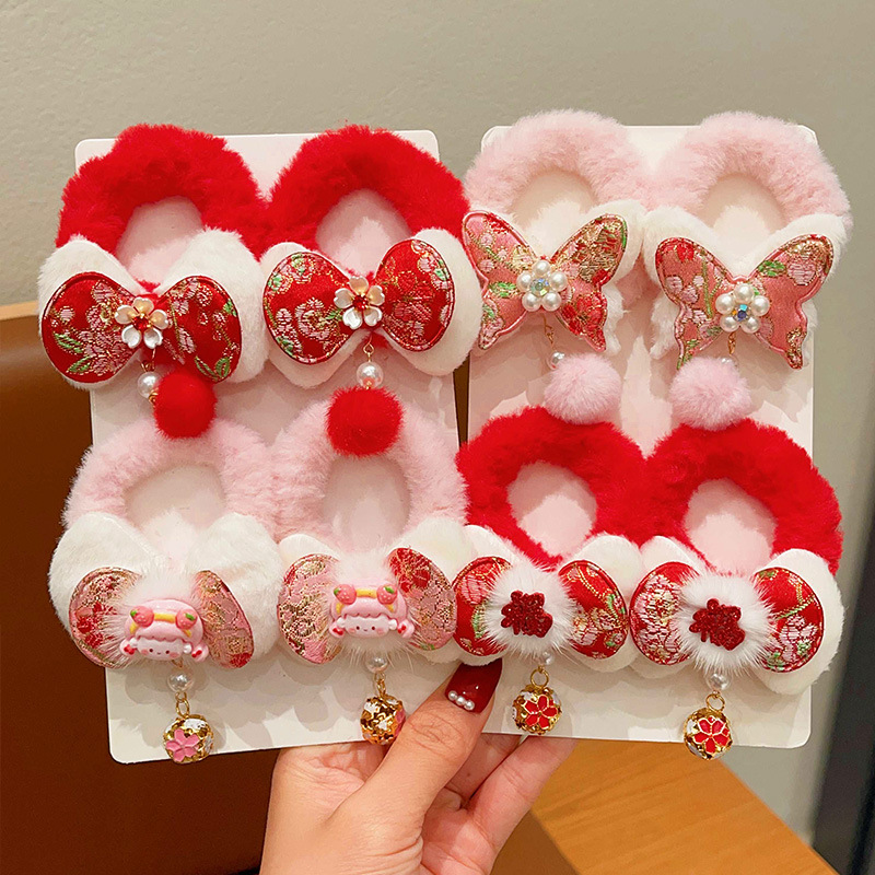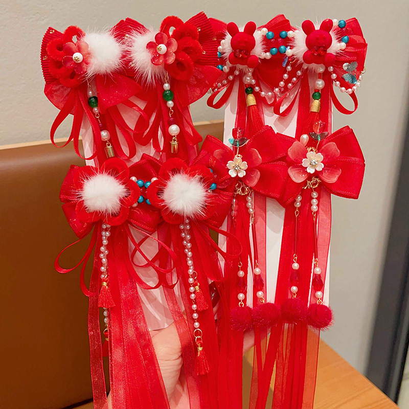 子供の新年のフリンジヘアクリップかわいい毛玉蝶結び髪飾りペアクリップ女の子中国風古風髪飾りヘアピン