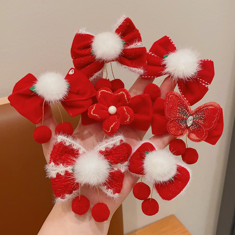 新年の子供の蝶結びのヘアピンの女の子のかわいい毛玉は髪飾りの赤い系のお祝いの髪飾りを挟みます。