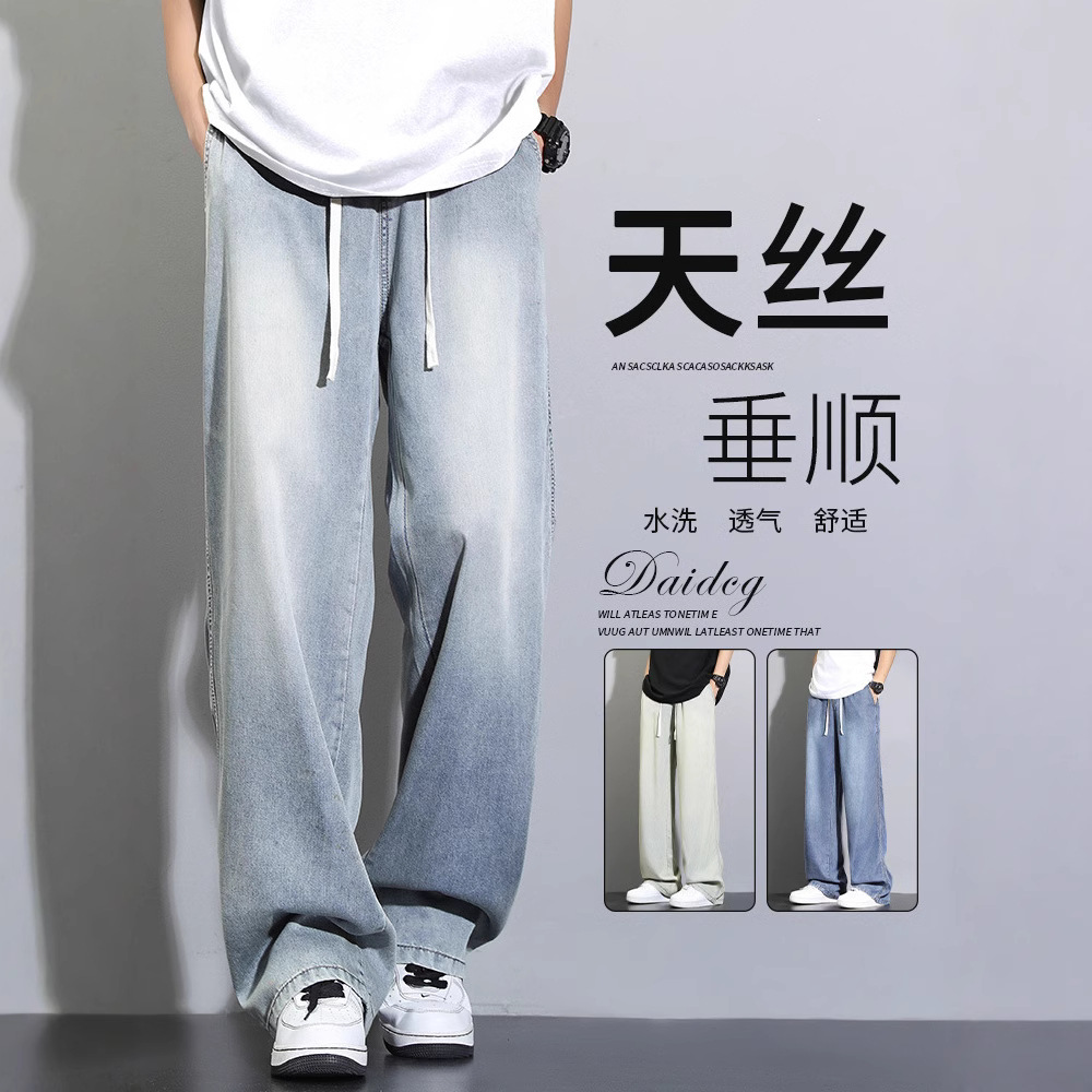 夏用テンセルドレープワイドレッグジーンズメンズルーズストレート薄型ユーススポーツ多用途カジュアルパンツ